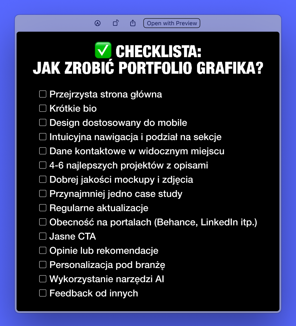 Ale to tylko podstawy. W tym poradniku szczegółowo podpowiadamy, jak pokazać swoje skille, jak opowiadać o projektach, gdzie wrzucać swoje rzeczy i co zrobić, aby portfolio nie wyglądało jak kolejna prezentacja, tylko jak ciekawe zaproszenie do współpracy. Na końcu publikujemy checklistę, która pozwoli ci sprawdzić, czy wszystko masz przygotowane, aby zaprezentować się światu.