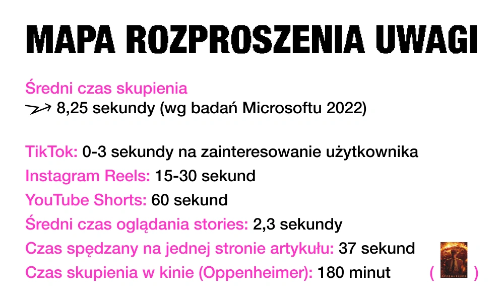 Scrollujemy w tempie, które jeszcze dwadzieścia lat temu wydawałoby się poza ludzkimi możliwościami. Reelsy, shorts i tiktoki są projektowane jak strzały dopaminowe – szybkie, dynamiczne, wciągające. Algorytmy wybierają te, które natychmiast przyciągają wzrok i utrzymują uwagę przez kilka sekund. W tym świecie liczy się natychmiastowa gratyfikacja: dowcip, szok, emocja. Krótka forma to nie tylko kwestia tempa życia, ale też optymalizacji zasięgów i niskiego progu wejścia.