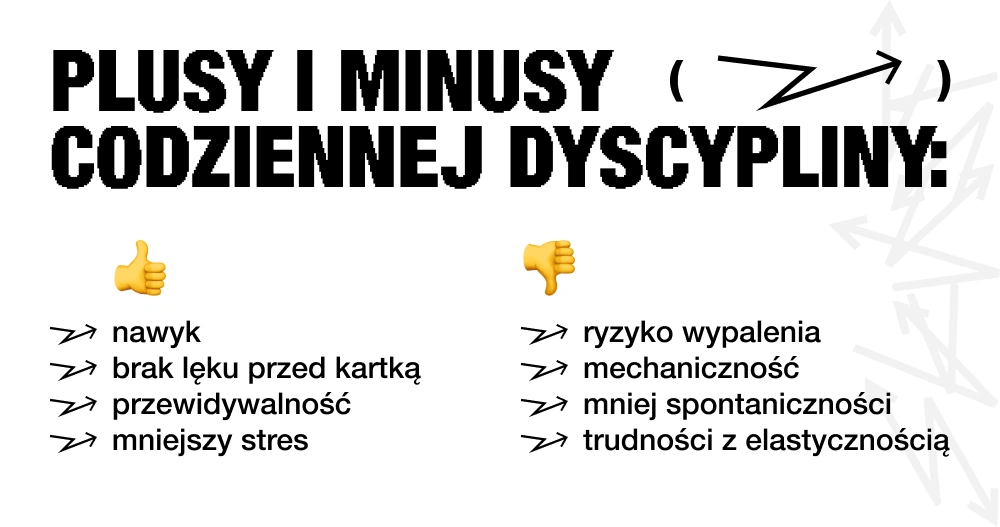 Jednak codzienna dyscyplina ma też swoje pułapki. Przede wszystkim istnieje ryzyko wypalenia. Narzucanie sobie obowiązku codziennego tworzenia, niezależnie od stanu emocjonalnego, może prowadzić do utraty radości i spontaniczności. I nie dotyczy to tylko pracy, ale też uprawiania sportu czy diety. Automatyzm, który daje regularność i przewidywalność, bywa wrogiem świeżości. Teksty, czy ilustracje mogą zacząć przypominać mechanicznie odtwarzane sekwencje. Dodatkowo sztywny rytm pracy często trudno pogodzić z życiem prywatnym, zwłaszcza jeśli nie pozwala się na elastyczność.