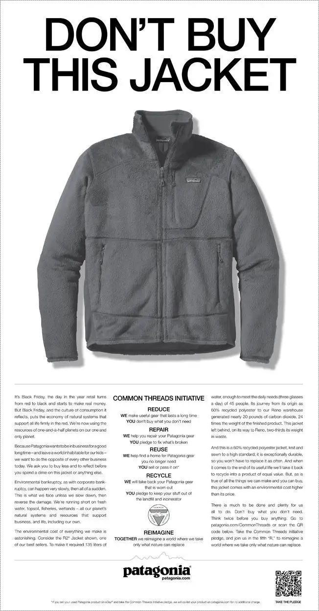 Nie był to jednak zwykły biznes. Chouinard od początku stawiał na jakość, minimalizm i troskę o środowisko. Zamiast gonitwy za szybkim zyskiem – odpowiedzialne decyzje. Zamiast mody, która przemija – produkty, które mają służyć latami. Patagonia konsekwentnie udowadnia, że marka może być narzędziem zmiany. Jej misja We’re in business to save our home planet mówi sama siebie. Firma od lat przeznacza 1% przychodów na cele związane z ochroną środowiska, wspiera lokalne inicjatywy ekologiczne i angażuje się w akcje społeczne. Jednym z najgłośniejszych działań marki była kampania Don’t buy this jacket, w której Patagonia otwarcie zachęcała klientów, aby kupowali mniej i naprawiali ubrania, zamiast stale je wymieniać. To decyzja biznesowa, która mogła wydawać się ryzykowna z punktu widzenia pomnażania zysku, ale okazała się bardzo skuteczna komunikacyjnie – odbiorcy mieli poczucie autentyczności marki, obdarzali ją szacunkiem, bo firma powiedziała coś, w co wierzy i chce, aby jej fani też uwierzyli.