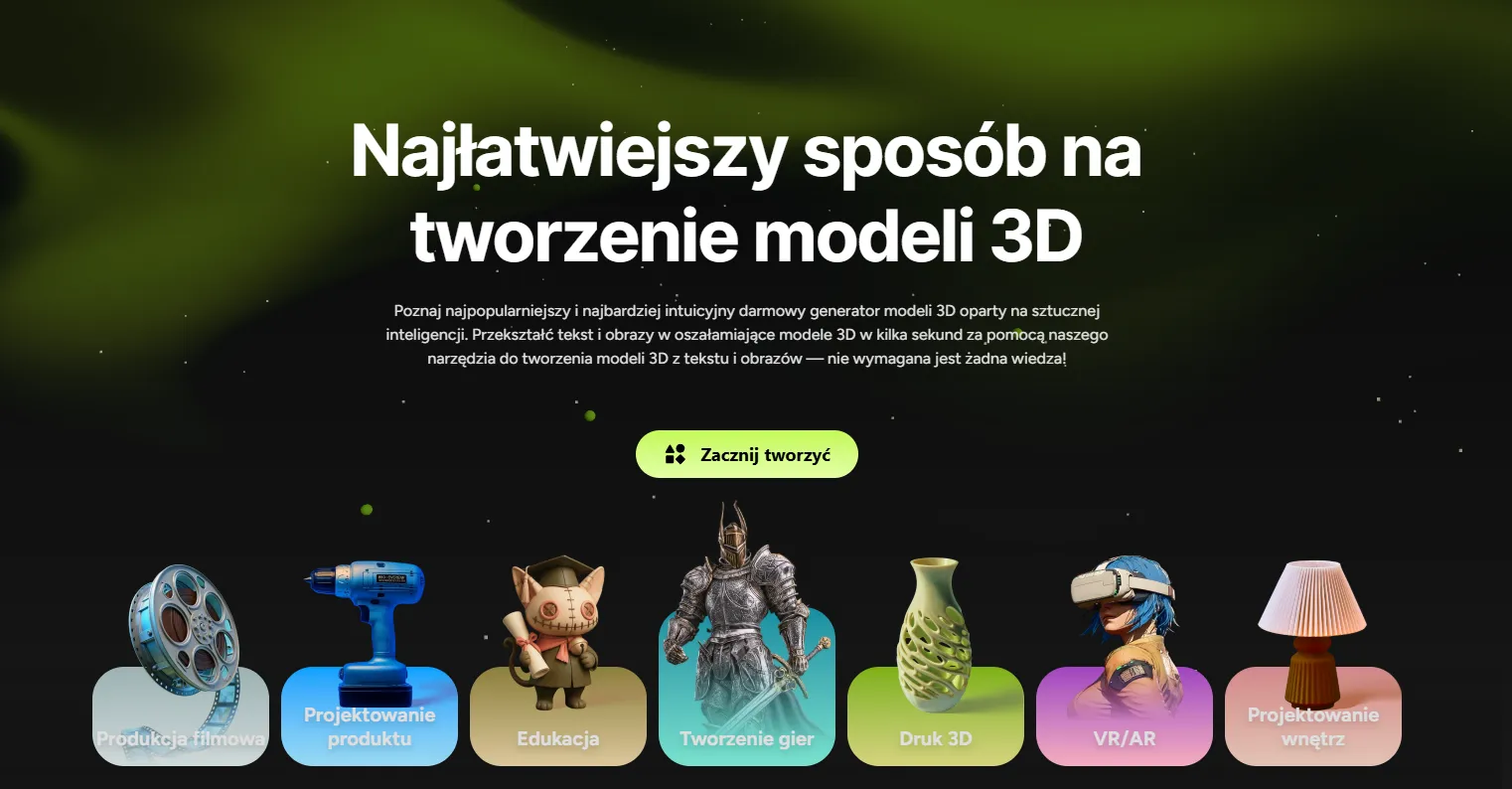 Zamienia tekst i obrazy w gotowe modele 3D lub voxele. Potrafi generować tekstury na podstawie promptu albo tzw. antypromptu (czyli opisu, czego w modelu ma zabraknąć). Meshy integruje się z Blenderem i Unity, co czyni go świetnym narzędziem do dynamicznej pracy koncepcyjnej.