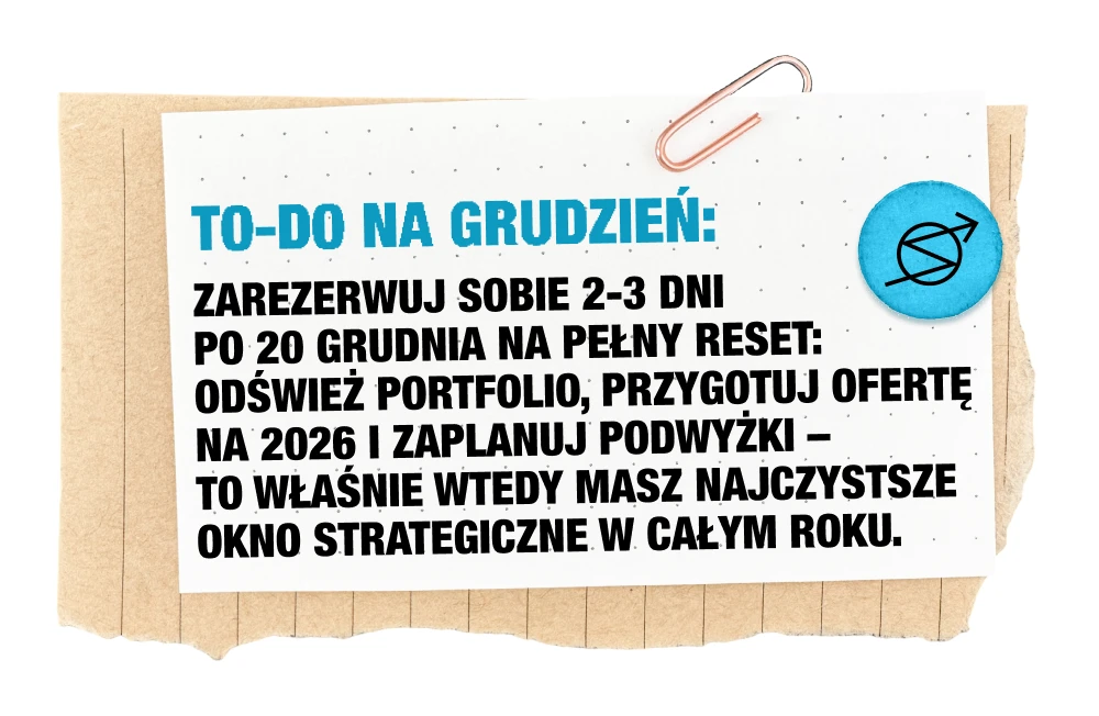 Po połowie miesiąca następuje gwałtowny zwrot. Decydenci wylogowują się z pracy, firmy zamykają rok, projekty spadają ze stołu i zapada cisza. Dla wielu freelancerów jest to najspokojniejszy okres w roku – nie dlatego, że klienci ich nie chcą, tylko dlatego, że świat biznesu robi wspólny reset. Ten moment warto wykorzystać strategicznie: uporządkować portfolio, zrobić audyt usług, przygotować ofertę na nowy rok, dopracować komunikację, a nawet zaplanować podwyżki. Grudzień to także czas, w którym warto zadbać o siebie – ciało, sen, głowę – żeby wejść w styczeń nie na oparach, tylko z klarowną energią.