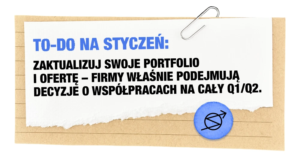 Po noworocznej przerwie rynek budzi się powoli – realny ruch zaczyna się zwykle po 10-15 stycznia, kiedy firmy zatwierdzają budżety i ruszają z planami na Q1. Widać więcej zapytań strategicznych niż realizacyjnych: rebrandingi, plany contentowe, przygotowania do kampanii wiosennych (co potwierdzają m.in. dane z raportu Useme 2025 oraz globalne trendy Upwork, gdzie początki roku oznaczają wzrost popytu na projekty planistyczne).