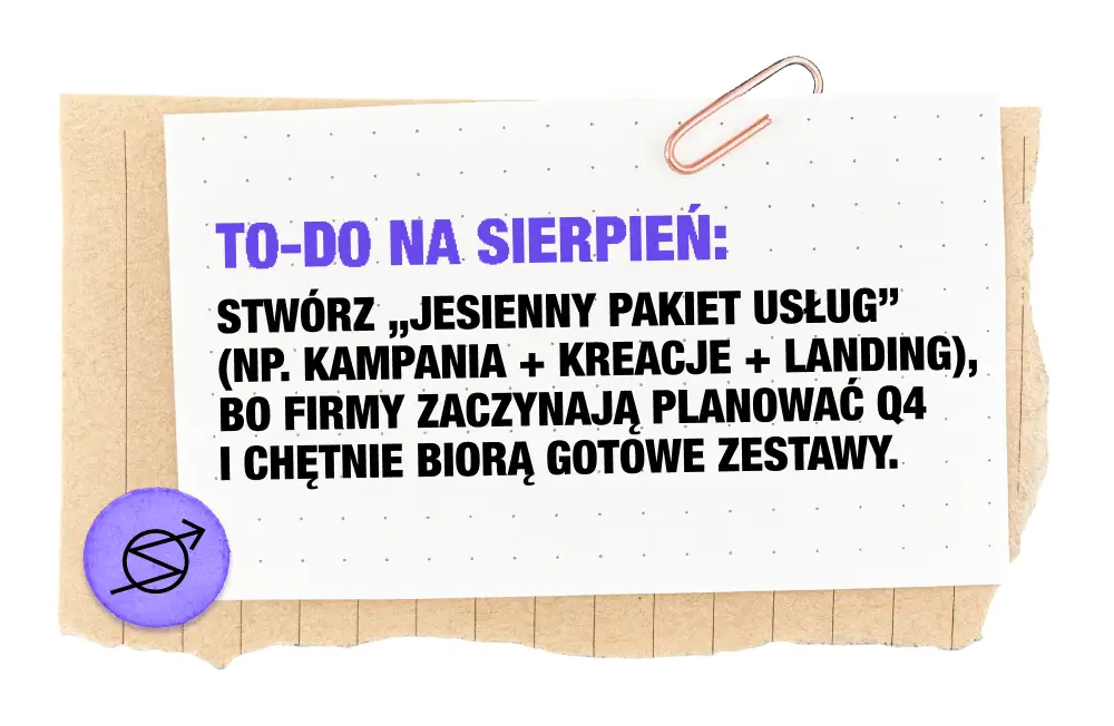 Sierpień jest pół-na-pół: jeszcze nie sezon, ale już nie pustynia. W drugiej połowie miesiąca wracają decydenci, pojawiają się pierwsze briefy na kampanie jesienne i zimowe. Zleceń jest więcej niż w lipcu, ale mniej niż we wrześniu — to rozgrzewka przed sprintem.