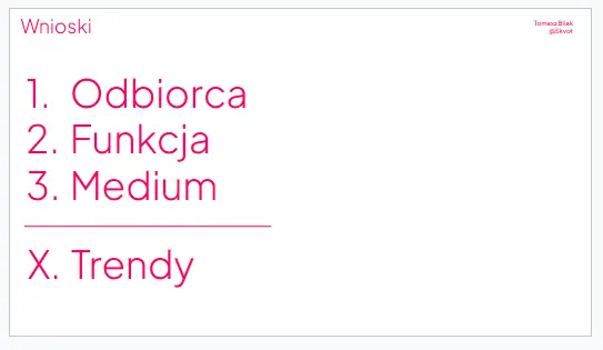 Trend z definicji dotyczy konkretnego momentu w czasie. Jest „istniejącym w danym momencie kierunkiem rozwoju”. To oznacza jedno: ma datę ważności. Tymczasem systemy identyfikacji wizualnej, marki, komunikacja – to rzeczy projektowane na lata. Jeśli ich rdzeń opiera się na czymś, co działa tylko „teraz”, ryzyko jest oczywiste. Po czasie zostaje estetyka bez znaczenia. Rzecz poprawna formalnie, ale pusta.