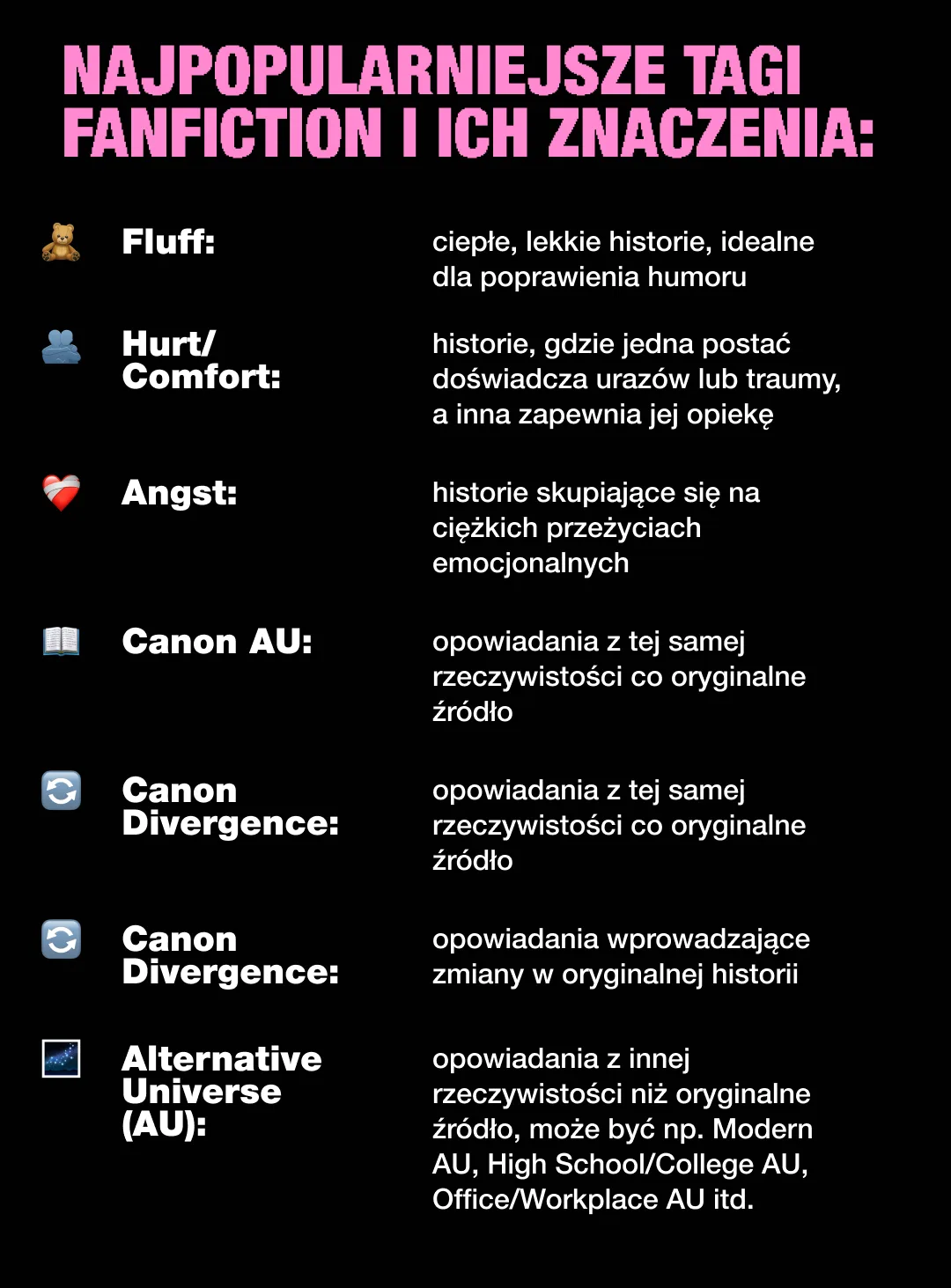 #1. Ratings i Warnings: zależnie od tego, jakie treści znajdują się w opowiadaniu, ratings (na stronie Archive of Our Own) dzielą się na: General Audiences, Teen and Up Audiences, Mature and Explicit. Dotyczy to zarówno treści erotycznych, jak i opisów przemocy itp. Warnings natomiast pozwalają ostrzec czytelników przed wydarzeniami w historii, które mogą być szczególnie trudne i wywołujące negatywne emocje.